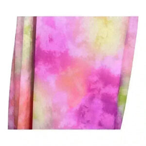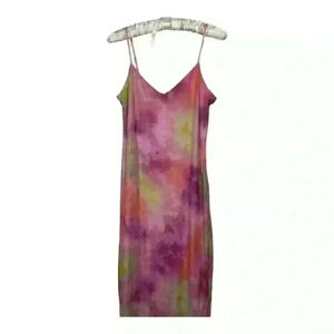 Tie-dyed mesh slipdress in vibrant pink, green and orange colors. Midi length can be styled on its own or layered with oversized sweaters and jackets for a casual, edgier look. Features adjustable spaghetti straps and V-neck. Fully lined and in excellent used condition.