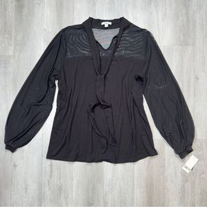 Women's plus size 1X black long sleeve top. Sheer mesh balloon sleeves and upper shoulder area. Long tie sashes in front. New with tags.