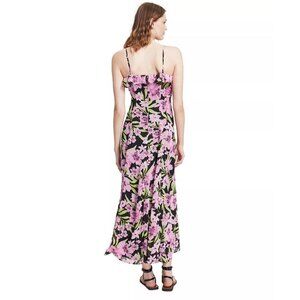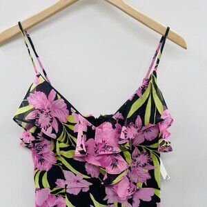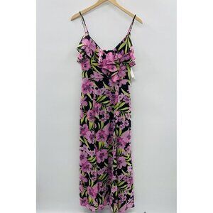 Bar III Women's Floral-Print Ruffled Maxi Dress in Havana Pink/Black Summer in style with Bar III's floral-print maxi dress. Adjustable straps Slit at front Lined Chiffon: Smooth, sheer woven fabric V-neck with ruffled trim; Maxi silhouette Ankle-length or longer casual dress Hidden back zipper Dry clean Shell & lining: polyester Size Small Pit to Pit: 17" Wide Waist: 14.5" Wide Hips: 24" Wide Length: 55" Long New with tags. Check out the other items listed in our store!