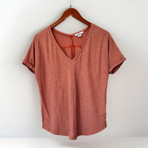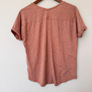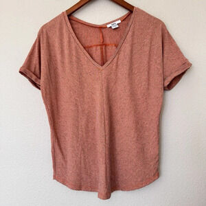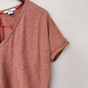 This is a Bar III women's t-shirt in size Small. It features a V-Neck and short sleeves, made of a lightweight and stretchy fabric blend of polyester, spandex, and rayon. The shirt has a modern striped pattern in orange and grey colors with a chevron design. It is a pullover style, suitable for travel and machine washable. Perfect for a stylish and comfortable summer look.