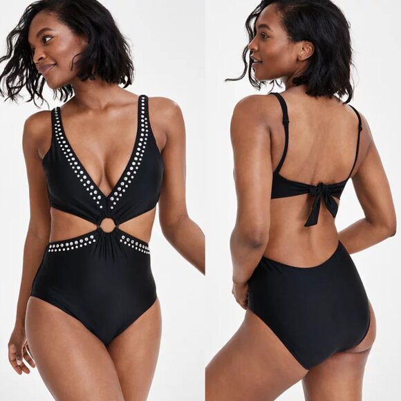 Let your inner bad girl go in this fierce studded monokini with side cut-outs from Bar III®.