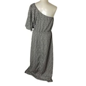 This dress is in good preowned condition. Maxi length one shoulder black and white polka dot pattern. Size small