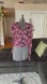 The measurements are 17 inches armpit to armpit and 19 inches shoulder to hem. The material is 100% polyester. The material is sheer. Please note the tag is attached but there is no price on it it was originally $70.