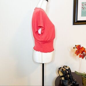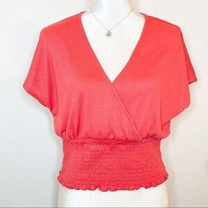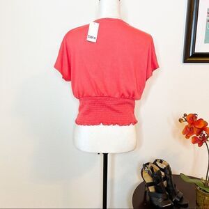 Super cute smoked-waist surplice top in coral. The textured knit of this Bar III v-neck top is nipped in at the waist with a wide band of smocking. Excellent for the coming spring with wide legged jeans and some platform espadrilles! NEW WITH TAGS!