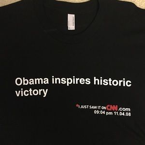 Rare historic, never worn Obama T-shirt. Own a part of history with this rare shirt from 2008 that chronographs the time & date of Obama's victory. "Obama inspires historic victory" "I just saw it on CNN.com 09:04 pm 11.04.08" (XL, American Apparel, 100% cotton preshrunk.