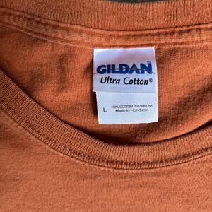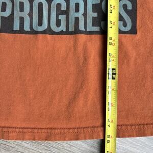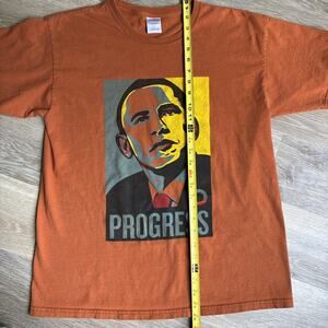 This men's Y2K Barack Obama political progress graphic shirt in size large is a vintage style t-shirt from the brand Gildan. The shirt features a rust color with a graphic design promoting a political message. Perfect for those seeking a unique and statement-making addition to their wardrobe, this shirt combines style with a nod to political history. A few barely visible fade areas on back… see pics..