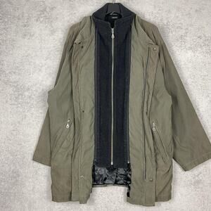 Previously worn with light overall wear, including a few faint spots on front and back and some creasing from use and storage. Inner black liner shows some lint. All zippers, buttons, pockets, and removable liner attachments are intact and functional.