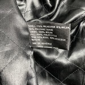 Materials (per tag): Shell 72% polyester, 16% polyurethane, 6% nylon; lining 100% nylon; fill 100% polyester; trim 60% wool, 40% viscose.