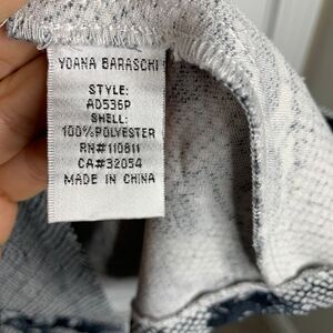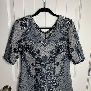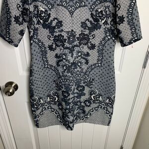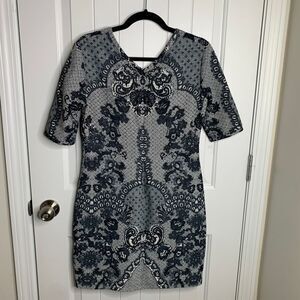 Elegant bodycon dress featuring a sophisticated lace-inspired print pattern in black and gray. V-neckline with elbow-length sleeves. Form-fitting silhouette with a classic knee length. Perfect for cocktail parties, evening events, or upscale dinners. The intricate pattern adds visual interest while maintaining a polished look. In excellent condition with no visible flaws.