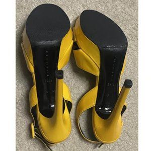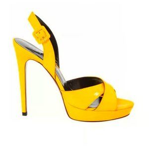 Barbara Bui Yellow Patent Leather Platform Sandals. Heel is approx 4 inches high. Criss Cross in front with Adjustable buckle strap. Size 36.5 Very high and sexy heels.