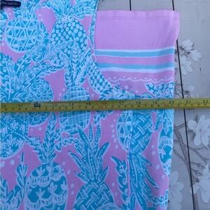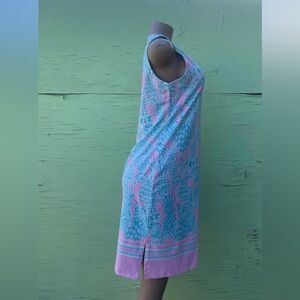 Vibrant sleeveless dress featuring a playful pink and blue pineapple pattern. Ideal for summer outings.