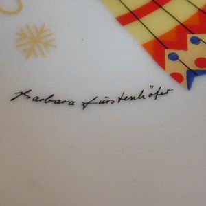 Plate is white with red around the edges, middle has an Angel with different colors & Barbara Furstenhofer stamped signature