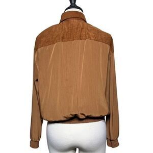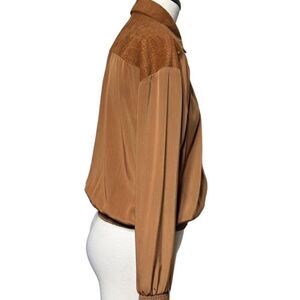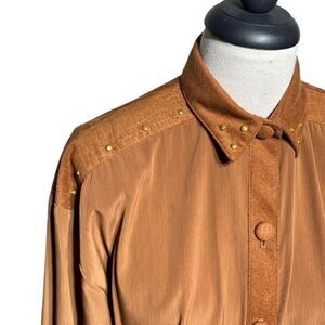 Made of 100% polyester. Features shoulder pads, elastic gathered cuffs and waistband, a moc croc faux suede trim down the center, on the shoulders, and fold down collar with gold studded embellishing. Laying flat measures 21" from pit to pit, and 22" shoulder to seam.