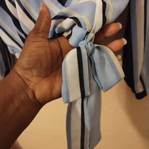 Barbara III Striped Blue, White & Black Long Sleeve Side Tie Faux Wrap Top Med.
