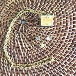 Barbara Mandrell Pendant Treasure Chest Locket Green Gold Tone Signed With Stars. In great condition and has 3 cute stars in the chest. Please let me know if you have any questions