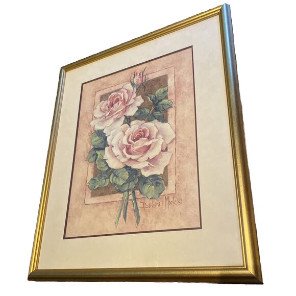 This beautiful Barbara Mock print features delicate pink and white roses in a vintage-inspired frame. The artist signature appears at the bottom and comes framed, making it a perfect addition to any floral or vintage themed collection.