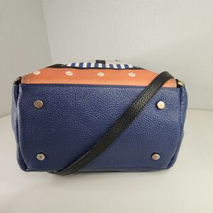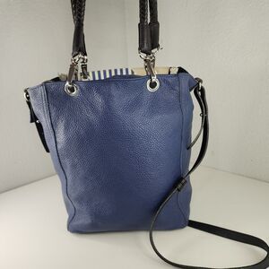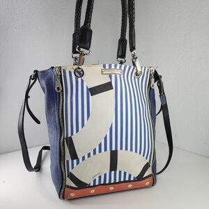 Barbara Rihl Tote Bag Blue Striped Print Leather Handles Shoulder Crossbody
