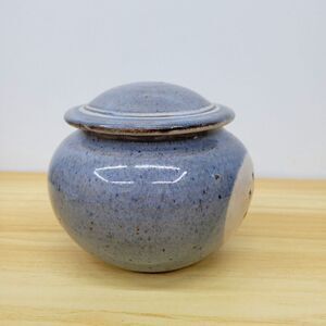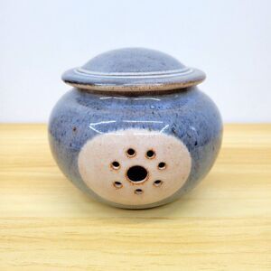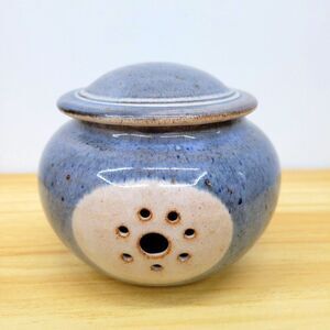 Handcrafted ceramic garlic keeper by North Carolina potter Barbara Sanders. Features a soft blue speckled glaze and vent holes on the front for proper air circulation. A functional and charming addition to any rustic or farmhouse-style kitchen.
