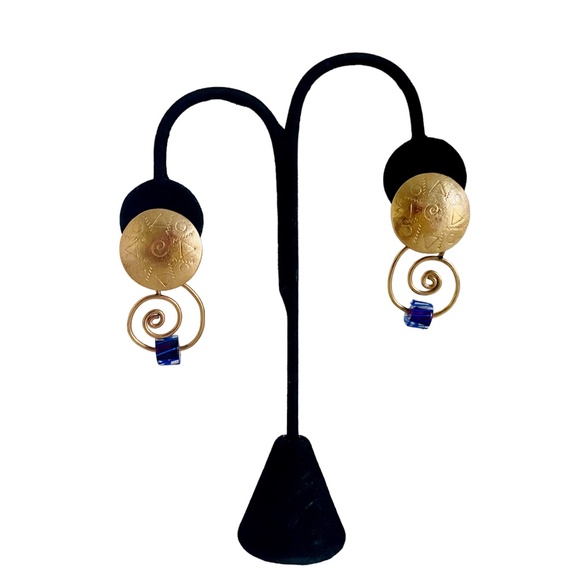 These 80s Artist Barbara Sucherman 14 KT Gold Plated Sterling Silver Blue Glass Earrings are in very good condition however they are missing the closure backings. This style of earrings by Sucherman are very hard to come by but we were able to pick them up from the estate of an avid jewelry collector in North Carolina. This earrings are like mini pieces of art.