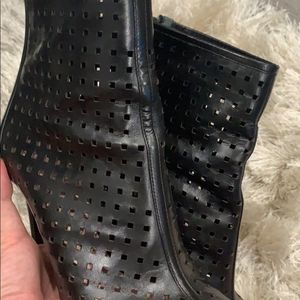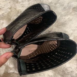 Black leather Barbara Bui peep-toe ankle boots with tonal stitching throughout, covered heels and zip closure at counters.