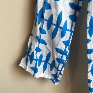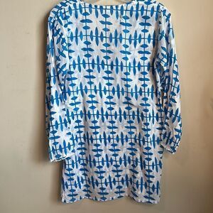 Blue & white patterned tunic with slit neck and sides. Long sleeve, lightweight. Has intentional dye spots that are shown in pic and video.