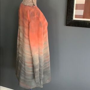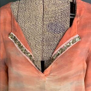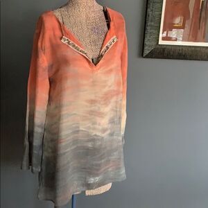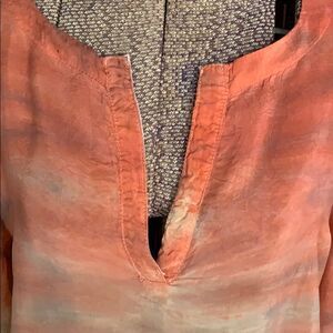 Barbara Lesser semi- sheer shaded watercolor tunic. V neckline with inner sequin band which shows when folded open or hidden if not- see pics. 100% cupra rayon. Size small. Excellent condition. Nonsmoking home.