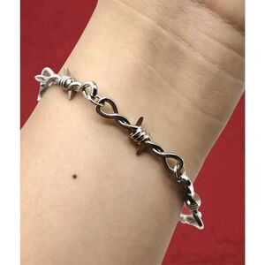Cool Kick A barbed wire bracelet in silver stainless steel meaning this is going to last a lifetime and be tarnish resistant. Wear with any punk, goth, bohemian or western outfit. Matching necklace and earrings available. Measures 8.5 inches.