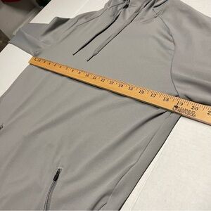 Stylish gray hooded sweatshirt with drawstrings and zippered pockets.