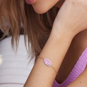 Featuring your favorite KS shape and the iconic Barbie™ script, the Barbie™ Gold Elaina Satellite Bracelet in Pink Iridescent Glitter Glass is bound to be your new bracelet stack staple. Even better—it’s reversible! Show off our custom-made Pink Iridescent Glitter Glass or flip to see the signature Barbie™ script.