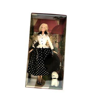 This collectible Barbie doll features an elegant polka dot ensemble and accessories. Accompanied by a white poodle, she is displayed in a charming box setting, making her a timeless addition to any collection.