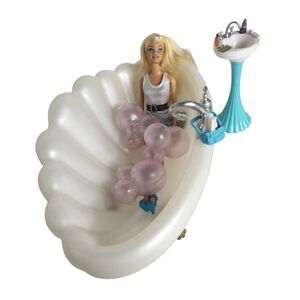 Barbie playset, doll with accessories, bathtub toy, doll bath set, Barbie bathtub, Barbie dollhouse, dollhouse accessories, Barbie bathroom, Barbie fashion, Barbie collection, imaginative play, dolls and playsets, Barbie accessories