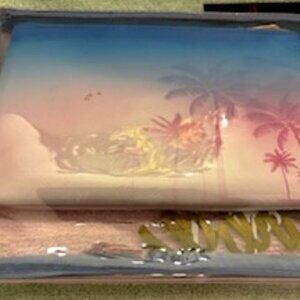 Barbie "Beach Dreams" slim pouch set two-pack set in tropical colors depicting pink palm trees against a blue sky on the smaller 8" x 5-1/2" zip close pouch with "Barbie" embossed on the front. This pouch is lined with pink fabric with a pocket to keep you organized. The larger pouch is 9-3/4" x 7-1/2" and is primarily clear with "Barbie" printed in gold on the front along with three pink palm trees. Both bags have the zip closure in polished gold tone with a gold tone zipper pull. Perfect for cosmetics or other items and even carrying school or work items, maybe even organizing tech supplies. NWT