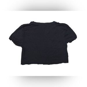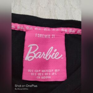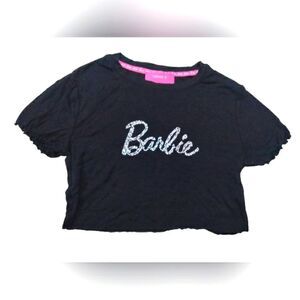 Stylish black crop top. Features glittery Barbie logo. Perfect for casual wear.