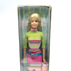 New in box Barbie Boutique doll, a groovy and trendy fashion statement from Mattel with model number 56431. Encased in its original packaging, this doll features a stylish, multicolored knit dress with a blue belt, complemented by matching pink boots and a chic striped handbag. The doll's blonde hair and blue eyes complete her fashionable look, making her a must-have for collectors and Barbie enthusiasts alike. This vintage Barbie is a delightful piece of nostalgia, perfect for adding a touch of retro charm to any collection.