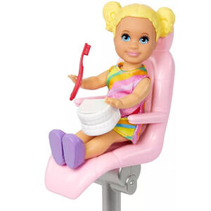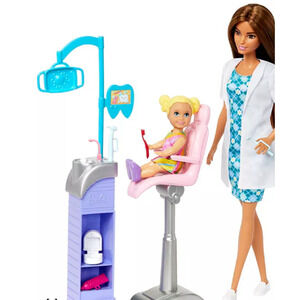 Barbie dentist doll is ready to brighten smiles. This dental clinic play set includes two dolls, an exam chair, a dental station, and smaller accessories like dental tools, toothbrush and toothpaste so kids can help Barbie doll take care of her adorable patient. Kids can dream big and imagine everything they can become with Barbie career dolls. Doll cannot stand alone. Colors and decorations may vary.