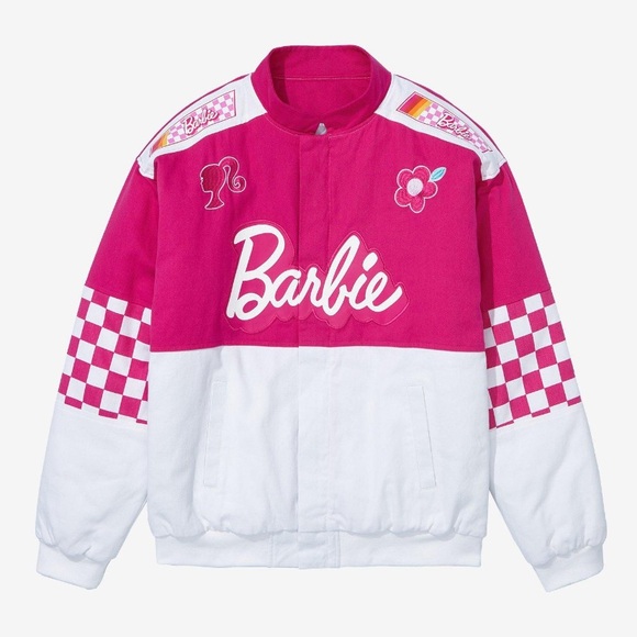 Gear up for a day of racing fun with this Barbie-inspired racing jacket! Featuring embroidered "Barbie" lettering on the front with the doll's silhouette and floral patches, the back includes a patch of Barbie and her car. With checkered sleeves, this jacket is perfect for bringing the iconic fashionista's style to your wardrobe.