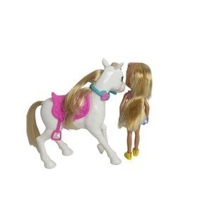 This Barbie Chelsea doll and pony set offers interactive play with a delightful white pony featuring a pink saddle and blue bridle. The Chelsea doll is dressed in a colorful outfit, ideal for imaginative adventures.