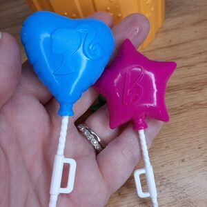 Barbie Club Chelsea Carnival Doll Amusement Park Balloon Booth includes yellow booth, pink star shaped "mylar" balloon", blue heart shaped "mylar" balloon, and green pinwheel. Does not include cash register, which would go on the open spot on the booth. These balloons are so cute!