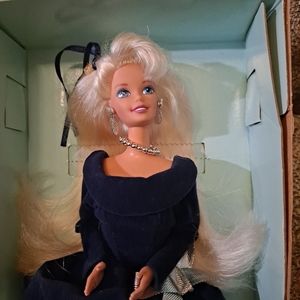 Beautiful Winter Barbie all dressed up. A sparkly blue and silver dress. She's wearing a necklace and earrings.
