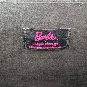 Black patent leather case with vintage Barbie images, top handle, two zippers.The iInside top can hold 5 makeup brushes or tubes such as (mascara).
