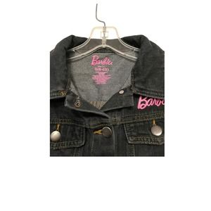 Gently pre-owned Barbie long sleeve denim jacket in dark blue. Collared, button closure, cotton blend denim. Barbie logo on front and girls logo on back. In good used condition.