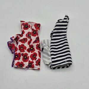 This set of Barbie doll dresses features a vibrant red poppy print dress with purple trim and a chic black and white striped strapless dress. These outfits offer a stylish addition to any doll's wardrobe, combining colorful floral patterns and timeless stripes for versatile fashion choices.