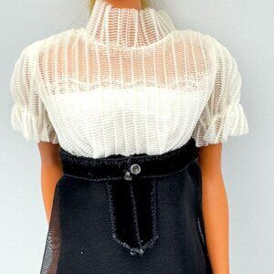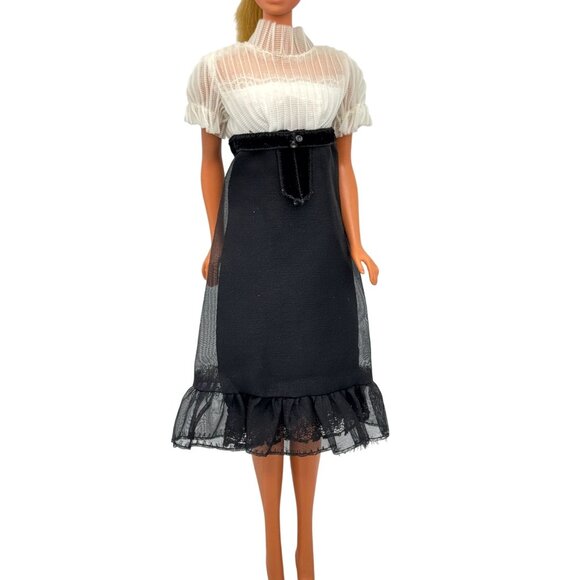 This vintage Barbie outfit features a black tulle skirt with ruffle hem and a white pleated top, adding a touch of classic elegance.