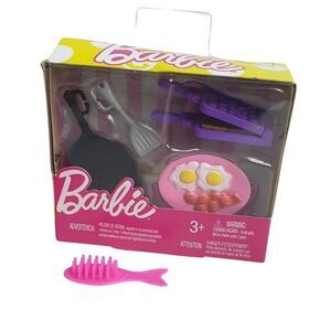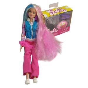 This Barbie doll showcases long, vibrant hair in tones of blue and pink, perfect for imaginative play. The set includes a complementary accessory set featuring cooking tools for expanded storytelling. Designed for children aged three and up, it promotes creativity and role-playing skills, enhancing developmental growth.