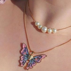 This piece features 2 separate necklaces, one with faux pearls and one with a colorful enamel butterfly, both chains are gold tone.