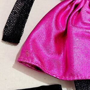 From 1995, we have the Mattel Barbie Fashion Avenue purple and black party dress with black nylons, shoes and handbag. This is the original, complete set. This outfit was recently unboxed and has never been on a doll. However, there are some rubs on the purple metallic dress from it touching the box and insert for so many years.