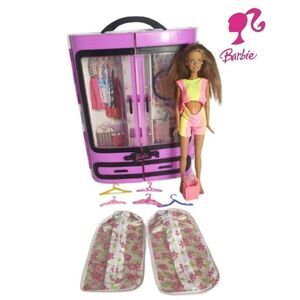 Barbie doll, fashion playset, wardrobe closet, doll accessories, dress bags, doll clothes, fashionista Barbie, pink wardrobe, girls toy, dress-up set, Barbie closet, fashion accessories, doll play