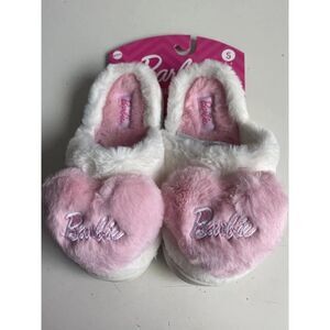 Barbie HEARTS Fluffy Slippers Pink Soft Indoor/Outdoor Women’s Sz S 5-6 Memory Foam Slip On Embroidered Pink White NEW