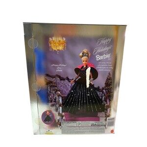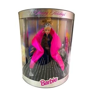 Never opened Happy Holidays Barbie, Special Edition from 1998. This specific Barbie is rare because of an error on the back of the box. The doll itself has a long shawl, while on the back of the box shes wearing a short cloak/hood. She is also wearing a belt on the front, and this belt is missing on the back image. Please check pictures for condition of box.
