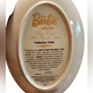 Barbie Oval Shaped porcelain plate depicting the "Here Comes the Bride Barbie, 1966". The plate is made by Enesco as part of the From Barbie with Love Collection - made in 1995. It is a numbered plate - #3633. Includes box and certificate of authenticity.